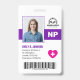 Cree una identificación elegante y profesional para enfermera especializada. Esta plantilla personalizable presenta un diseño limpio y moderno con espacio para una foto, nombre, identificación de empleado, ubicación, título (NP), fecha de vencimiento y un código de barras para mayor seguridad. Personalice fácilmente con el logotipo de su hospital o clínica, lo que la convierte en una solución de identificación perfecta para profesionales de la salud. Esta plantilla es ideal para hospitales, clínicas, hogares de ancianos y otras instalaciones de atención médica. La paleta de colores morado profesional crea una estética limpia y confiable.