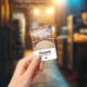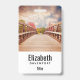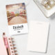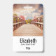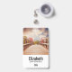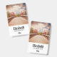 Tarjeta de nombre personalizada con una fotografía panorámica. Un puente de madera que conduce a un camino rodeado de árboles que cambian de color.