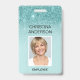 Girly Aqua Verde azulado Blue Professional Corporate Work Name, Photo and Job Title Faux Purpurina y Sparkle Ombre ID Photo Vertical Business Badge. Este diseño es sencillo y fácil de usar al cambiar tu nombre y apellido, así como el título de tu trabajo y la foto de tu jefe de empresa.