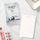 Etiqueta con nombre personalizado con una imagen de acuarela que presenta una silueta de reno negro parado entre algunos pinos. Esquema de color neutro gris, negro y blanco.