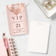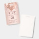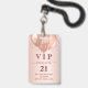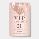 Una insignia moderna, elegante y glamurosa para una fiesta de cumpleaños 21 (o de cualquier edad). Un fondo de gradiente dorado subió con goteos falsos de purpurinas, pinturas de goteo. Con el texto: VIP. Personalice y agregue nombre, edad, dirección/fecha. El nombre está escrito con un guión moderno de estilo con letras de color rosa oscuro y con toques. Para que los cambios sólo eliminen el nombre del ejemplo, deje los espacios o la emoji delante y después del nombre. Atrás: sin diseño ni color (menos costoso)