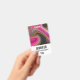 Una etiqueta con un diseño abstracto de aspecto divertido. Los colores rosa y negro se mezclan y se entrelazan en un movimiento giratorio. Purpurina dorada falsa entre las capas.