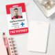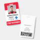Personalice este personal médico vertical o las insignias de primera respuesta con una foto y un nombre de empleado, junto con varios campos de texto personalizados para el título o el papel, el nombre del hospital o del centro de salud, el número de identificación del empleado o válido hasta la fecha, junto con el logotipo de la empresa. "PRIMER RESPONSABLE" o el texto deseado aparece en la parte inferior con letras en negrita en blanco para una fácil identificación. Personalizar con un código de barras en la parte posterior si es necesario, junto con información de devolución u otros detalles.