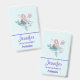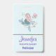 Insignia con una adorable ilustración. Diseñada con una linda niña sirena montando un delfín feliz. Un pequeño amigo medusa los acompaña. Decorado con pequeñas salpicaduras de brillo dorado falso. Fondo azul claro con lunares rosados desvanecidos.
