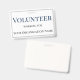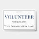 Esta placa de identificación incluye el título "Voluntario" impreso en una gran letra azul en negrita cerca de la parte superior de la placa. El siguiente texto contiene la información del voluntario o empleado y el nombre de la empresa u organización. La placa de identificación voluntaria está bordeada por un simple marco gris.