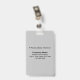 Un sencillo botón de diseño de textos con foto de empleado que puede personalizar para usted y sus empleados. Los colores de diseño y la forma son textos negros sobre el fondo gris y la forma rectangular de formato de retrato. Para el personalizar de esta insignia, escriba el nombre de su empresa o empresa, dirección, número de teléfono, nombre del empleado, título del empleado, número de identificación del empleado y cargue la foto del empleado. Después de teclear textos y de subir fotos, por favor compruebe la apariencia en el frente y en el trasero. Si la apariencia le resulta agradable, puede realizar su pedido ahora. Si necesita cambiar el tamaño y mover los textos y la foto para que encajen en este botón, por favor cambie la herramienta de diseño. También puede realizar otros cambios en la herramienta de diseño según la apariencia que prefiera, como cambiar el color de fondo, el color del tipo de letra y el estilo del tipo de letra.