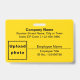 Diseño de placa de identificación con texto simple y foto del empleado que puedes personalizar para ti y tus empleados. Los colores y la forma del diseño son textos negros sobre fondo amarillo y forma rectangular en formato horizontal. Para personalizar esta placa, escribe el nombre de tu empresa o negocio, dirección, número de teléfono, nombre del empleado, cargo del empleado, número de identificación del empleado y sube la foto del empleado. Después de escribir los textos y subir la foto, por favor revisa la apariencia en el anverso y reverso. Si la apariencia es de tu agrado, puedes realizar tu pedido ahora. Si necesitas cambiar el tamaño y mover los textos y la foto para que se ajusten a esta placa, por favor hazlo en la herramienta de diseño. También puedes hacer otros cambios en la herramienta de diseño según la apariencia que prefieras, como cambiar el color de fondo, el color de la letra y el estilo de letra.