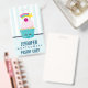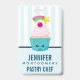Marca de nombre con un patrón rayado azul claro y blanco emparejado con un patrón de puntos polka azul y rosa. Encendido sobre la parte superior hay un lindo quequito azul con helado rosado y una cara sonriente kawaii. Una cereza en la parte superior también tiene una cara adorable y feliz. Una estrella fugaz está volando en el aire