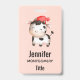Una etiqueta con un nombre con una imagen adorable de una vaca manchada de blanco y negro con un gorra rojo.
