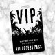 Tarjeta VIP para eventos especiales de acceso a entradas de conciertos. Esta insignia VIP en blanco y negro presenta un diseño de silueta audaz, perfecto para un concierto al aire libre o un fiesta con un ambiente de Coachella. La fachada muestra a una multitud de asistentes a los conciertos con los brazos levantados, rodeados de palmeras, lo que crea una llamativa atmósfera festiva. "VIP" se muestra en la parte superior en negrita, con el nombre del evento, la fecha y "All Access Pass" colocados en la parte inferior. El color de fondo se puede cambiar para que coincida con el tema, y todos los colores del texto y del tipo de letra son totalmente personalizables. El reverso está actualmente en blanco, lo que le da espacio para agregar su propio mensaje, logotipo o información adicional de evento si lo desea.