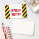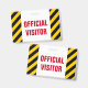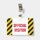Este diseño de insignia presenta un patrón de rayas negras y amarillas, junto con el mensaje "VISITANTE OFICIAL" en texto en negrita. Podría usarse para identificar a las personas que son visitantes autorizados en una oficina de una empresa o algún evento.