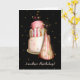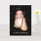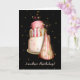 Esta es una elegante tarjeta de cumpleaños para ella, con una torta rosa, dorada y blanca de cumpleaños y una gorra de cumpleaños a rayas sobre un fondo negro. Detrás de las imágenes hay estrellas doradas, y el pastel y el gorra tienen cada una decoraciones estrella en la parte superior. El texto blanco de la parte inferior puede personalizarse, al igual que el texto interior. En el interior hay una imagen adicional de globo rosa y azul de cumpleaños. *La imagen prediseñada utilizada en este diseño está protegida por derechos de autor por Encore Software, Inc., que permite su uso a sus licenciantes. Todos Los Derechos Reservados.
