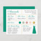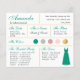 Una tarjeta de información de la dama de honor para un boda de color verde esmeralda y oro, que incluye información sobre la fecha y ubicación del boda, los colores del boda, la fiesta de novias, el vestido de la dama de honor y un mensaje de proposición de la dama de honor. El nombre de la dama de honor y los títulos están escritos en un guión verde y elegante. En la esquina inferior derecha hay un vestido verde esmeralda. En el centro, están los colores bodas en círculos. Los colores, incluido el color de la vestimenta boda, se pueden cambiar, excepto el dorado, que es un Relieve metalizado de imitación de oro. Los colores por defecto son los verdes, los rosa y el oro. La parte posterior es de color verde esmeralda, como el color del vestido de la dama de honor.