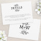 Sencilla pareja de bodas monogramas con detalles de hojas de arte de línea botánica para una hermosa y única tarjeta de información y detalles minimalista de bodas en blanco y negro. Cambie cualquiera de los textos a personalizar.