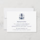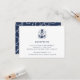 La tarjeta de información de recepción de estilo costero presenta los detalles de su recepción de boda en azul marino, acentuada con una ilustración de un ancla de barco dibujada a mano con sus iniciales en su interior. Las tarjetas se revierten a un patrón de cuerda náutica en bucle en blanco sobre azul marino. Diseñado para coincidir con nuestra colección de invitaciones de boda 'Bien Anclado'.