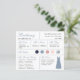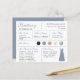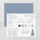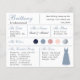Una tarjeta de información de dama de honor azul polvoriento y plateado, que incluye información sobre la fecha y ubicación de la boda, los colores de la boda, el grupo de la novia, el vestido de dama de honor y un mensaje de propuesta de dama de honor. El nombre de la dama de honor y los títulos están escritos en una elegante letra cursiva azul polvoriento. En la esquina inferior derecha, hay un vestido azul polvoriento. En el centro, están los colores de la boda en círculos. Los colores, incluido el color del vestido de novia, se pueden cambiar, con la excepción del círculo plateado, que es de lámina plateada falsa.