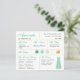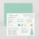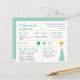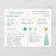 Una tarjeta de información para dama de honor para una boda de menta y dorado, que incluye información sobre la fecha y ubicación de la boda, los colores de la boda, el grupo de la novia, el vestido de dama de honor y un mensaje de propuesta de dama de honor. El nombre de la dama de honor y los títulos están escritos en una elegante letra cursiva de color verde menta oscuro. En la esquina inferior derecha, hay un vestido menta. En el centro, están los colores de la boda en círculos. Los colores, incluyendo el color del vestido de novia, se pueden cambiar, con la excepción del círculo dorado, que es de lámina dorada falsa. Los colores predeterminados son tres tonos de menta, blanco y dorado. La parte posterior es de color menta claro como el color del vestido de dama de honor.
