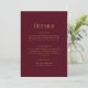 Complete su suite boda con nuestra tarjeta de inscripción para detalles del Boda de Borgoña Monograma. Esta tarjeta presenta con elegancia detalles adicionales del boda en un fondo burdeos sereno adornado con un delicado monograma. Una adición perfecta para informar a los huéspedes sobre detalles específicos de los bodas.