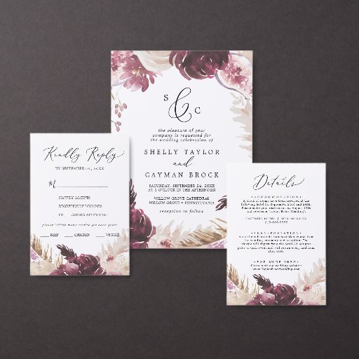 Esta tarjeta de alojamiento con detalles de hierba de boho pampas es perfecta para un boda de verano. El diseño de la acuarela floral incluye flores bohemias de color burdeos y rosas rubias con brotes de pampas neutras y hojas de palmera doradas secas.