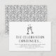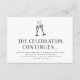 ¡Que continúe la fiesta! Las tarjetas de inserción de invitación a la fiesta de después de la boda en negro y blanco elegantes presentan "la celebración continúa" en tipografía negra con los detalles de tu fiesta debajo, coronadas por dos copas de champán ilustradas unidas por un corazón. El tamaño pequeño permite que las tarjetas se incluyan con tus invitaciones de boda o se distribuyan en la recepción. El reverso de las tarjetas tiene un patrón de enredadera y brotes botánicos en negro y blanco a juego.