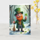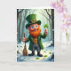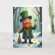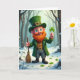 Esta tarjeta de felicitación muestra a un duende alegre parado en un bosque cubierto de nieve, sus ojos verdes brillantes y mejillas sonrosadas resaltadas por una barba naranja encendida. Lleva un abrigo esmeralda y un sombrero alto a juego con patrones tenues de estilo celta, además de una hebilla dorada que atrapa la luz suave. En una mano sostiene un trébol de tres hojas ☘️ como si se lo ofreciera a alguien justo fuera de la escena, y en la otra agarra una pequeña escoba rústica como si acabara de terminar de despejar un camino para un amigo. Detrás de él, los árboles desnudos se desvanecen en azules y blancos pálidos, con una ligera niebla o nevada suspendida en el aire. Pequeños tréboles verdes 💚 asoman a través de la nieve alrededor de sus botas negras robustas, lo que añade un suave contraste al suelo invernal. El texto de felicitación se encuentra cerca de la parte superior en letras verdes, con una línea más