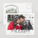 Anuncio de compromiso rústico y casual que comienza con la foto de su pareja. El título debajo es Año Nuevo Nueva Aventura. El texto se puede cambiar para adaptarse a su compromiso único. Las dos líneas de texto debajo se pueden personalizar. La parte posterior de la tarjeta de anuncio presenta un paisaje montañoso rústico y más texto para que usted personalice.