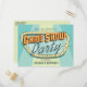 Tarjeta de invitación a fiesta de concurso televisivo con un letrero tipográfico de "Game Show Party". Estos diseños incluyen elementos de azul, amarillo, rojo y naranja, un podio de concurso, letrero luminoso y elementos inspirados en concursos retro. Los productos incluyen una plantilla para personalización personal.
