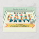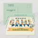 Tarjeta postal de invitación a fiesta de juegos de mesa con una tipografía divertida de "Board Game Party". Estos diseños incluyen elementos de azul, amarillo, rojo y naranja, un fondo de tablero de juego, dados, piezas de juego, cartas de juego y elementos inspirados en juegos de mesa. Los productos incluyen una plantilla para personalización personal.