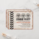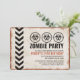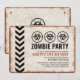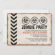 Invitación con estilo vintage para una fiesta temática de apocalipsis zombie con un letrero desgastado y símbolos de riesgo biológico.