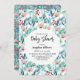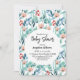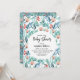 Tarjeta de invitación a la ducha de bebé plana con adorables imágenes de plantas acuáticas con suaves hojas de color azul y esmeralda pastel, ramas y flores rosas suaves.