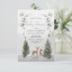 ¡Esta hermosa invitación a la ducha de bebé es perfecta para cualquier futura madre! Este diseño presenta una hermosa escena de bosques de invierno que incluye ciervos para bebés, zorros, conejos y aves de invierno. La nieve que cae suavemente cubre los pinos y las colinas lejanas. Las modernas fuentes lúdicas completan este diseño. Vea toda la colección para ver más elementos coincidentes.