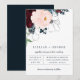Elegante invitación de boda con arreglo floral acuarela en rosa suave, burgundy, azul marino y bocetos artísticos de carbón, con diseño tipográfico moderno y chic en azul marino. La parte trasera de la tarjeta presenta un color sólido en azul marino.