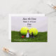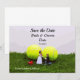 Tarjeta de invitación de boda de tenis con novia y novio en césped verde con fondo de pelotas de tenis