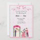Celebra tu gran día con estilo con esta hermosa tarjeta de invitación a la boda. Con una novia y un novio románticos parados bajo un arco floral decorado con globos en forma de corazón rosa, mientras los fotógrafos capturan el momento especial. El suave fondo rosa con motivos y la elegante tipografía hacen de esta invitación perfecta para bodas modernos y clásicos por igual. Una manera única de invitar a sus seres queridos a compartir su felicidad.