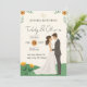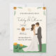 Invita a tus seres queridos a celebrar tu historia de amor con esta encantadora invitación de boda ilustrada. Este diseño moderno presenta a una adorable pareja de dibujos animados abrazados, sobre un fondo de suaves colinas verdes y flores silvestres amarillas. La paleta de colores cálidos y las fuentes de escritura a mano dan un toque único y amigable.