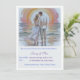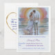 Una encantadora y simple tarjeta de invitación de boda boho de una pareja en la playa al atardecer en un fondo azul claro