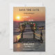 Tarjeta de Save the Date con un atardecer en la playa con un arbor de rosas y luces de cuerda. En la parte posterior hay espacio para tu propia foto. Puedes usar la plantilla de código QR para enlazar con tu propio sitio web.