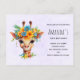 Tarjeta postal de invitación de cumpleaños con una ilustración caprichosa de acuarela que presenta una cara de jirafa que lleva una corona floral primaveral bonita. Colorido y lindo.