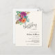 Tarjeta postal de invitación de cumpleaños con un arreglo floral que contiene hermosas rosas rosadas, naranjas y blancas rodeadas de hojas verdes.
