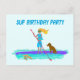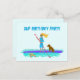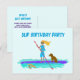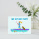 Tarjeta de invitación de cumpleaños con tema de remo en paddle con diseño ilustrado que muestra a una niña remando con su perro a bordo, mientras una tortuga marina nada junto a ellos. Personalice el texto de la plantilla en la parte delantera y trasera para una fiesta de bienvenida.