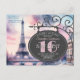 ¡Ooh La La! Invitación de cumpleaños Sweet 16 con estilo vintage parisino "Noche en París". El letrero de la calle francesa incluye los detalles de la fiesta, que se pueden personalizar junto con la información de RSVP en la esquina superior izquierda. Perfecto para una fiesta de cumpleaños celebrada en París o simplemente una fiesta con tema francés. Los gradientes rosados chic sirven como fondo de puesta de sol para la Torre Eiffel y el letrero retro.