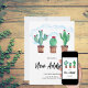 Esta tarjeta de invitación en movimiento está decorada con cactus acuarelas, un cielo azul y New Address en una tipografía elegante. Personalizable fácilmente con tu nueva dirección. Utilice la Herramienta de diseño para cambiar el tamaño, estilo o color del texto. A medida que creamos nuestra obra de arte no encontrarás esta imagen exacta de otros diseñadores. Acuarela original © Michele Davies.