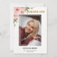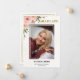 Esta invitación de graduación presenta flor rosa, foto de graduado, nombre, año de graduación, junto con más información y mensajes en la parte de atrás.