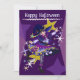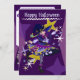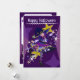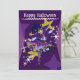Cute Halloween Neko Bruja en una tarjeta de vacaciones morada en el frente. En la parte posterior está el texto de la invitación que se puede personalizar por los clientes.