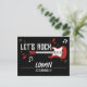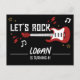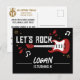 ¡Vamos a rockear! Esta invitación de tarjeta postal impresa por delante y por detrás es perfecta para una fiesta de cumpleaños con tema de música rock and roll. La parte delantera de la tarjeta postal presenta elementos negros, dorados y rojos, incluyendo una guitarra eléctrica, estrellas, notas musicales y rayos. Personaliza la parte trasera de la tarjeta postal con los detalles de tu fiesta para la invitación definitiva y fácil de enviar.