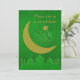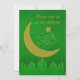 Tarjeta de invitación elegante de fiesta de Eid con una silueta de mezquita, luna y estrella en verde y dorado.