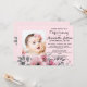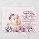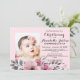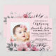 Una elegante tarjeta de invitación para bautizo con foto en rosa que puedes personalizar y enviar a tus invitados para celebrar tu evento de bautizo. Todo el texto está configurado con tipografía popular. Un patrón floral complementa la parte delantera y trasera de la invitación sobre un fondo rosa suave. ¡Disfruta!