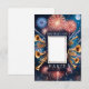 Celebra la llegada del Año Nuevo con esta deslumbrante invitación, que presenta un cielo nocturno que estalla con fuegos artificiales coloridos y una luna llena luminosa. Las trompetas doradas anuncian las festividades, mientras que el espacio blanco central espera los detalles de tu fiesta. El banner proclama “Fiesta de Nochevieja” en una elegante escritura, rodeado de destellos dorados, que marca el tono para una noche inolvidable.