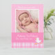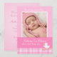 Una tarjeta de invitación para recién nacidos de color rosa dulce con un lindo pato y un patrón de revisión. Personaliza con tus detalles y una foto especial de tu hija. Una buena manera de anunciar su nueva llegada a la familia y amigos.