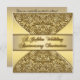 Una imagen de diseño digital con un tema de color dorado para esta tarjeta de invitación de aniversario de bodas de 50 años única, que incluye variedad de imágenes, formas, patrones, estilos y fuentes personalizadas. También viene con un diseño complementario en el reverso con texto personalizable para su ocasión especial.
